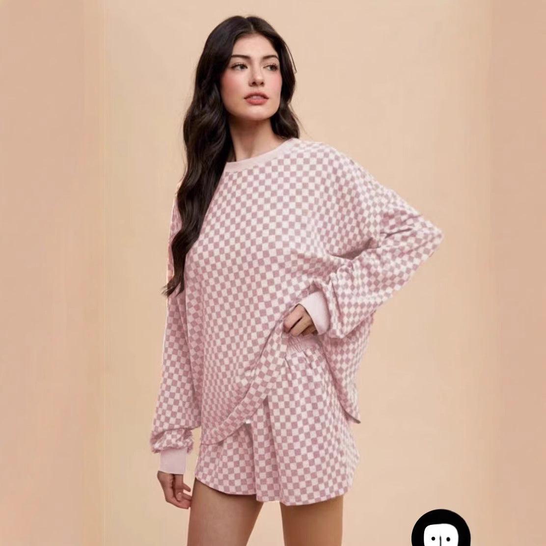 Step out in effortless casual style with the Simple Pattern Round Neck Top and Drawstring Shorts Suit, a chic Japanese- and Korean-inspired set perfect for everyday wear. Featuring a classic plaid pattern in versatile shades of black, pink, and camel, this suit combines a long-sleeve round neck top with comfortable drawstring shorts, offering both style and ease. The painted and stitched collage details add a subtle artistic flair, making the outfit stand out while keeping it casual and wearable.